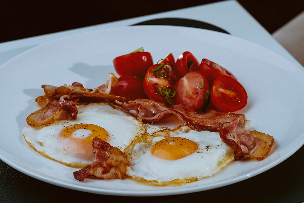 Two fried eggs, cherry tomatoes, green onion, homemade sourdough bread, bacon
