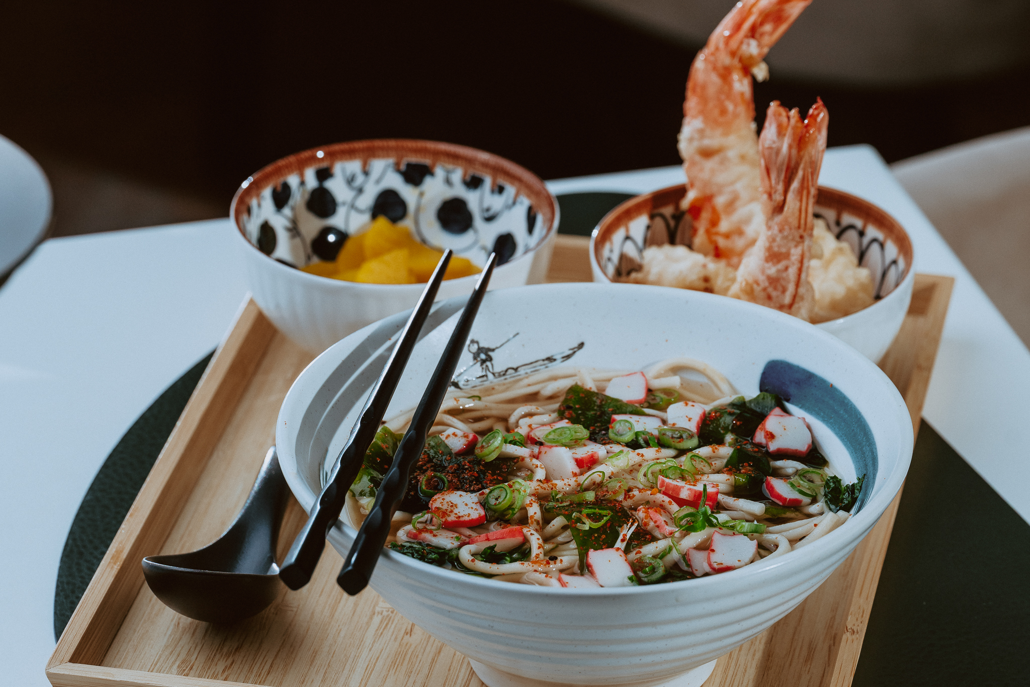 Dashi broth, shrimp tempura, wakame, surimi